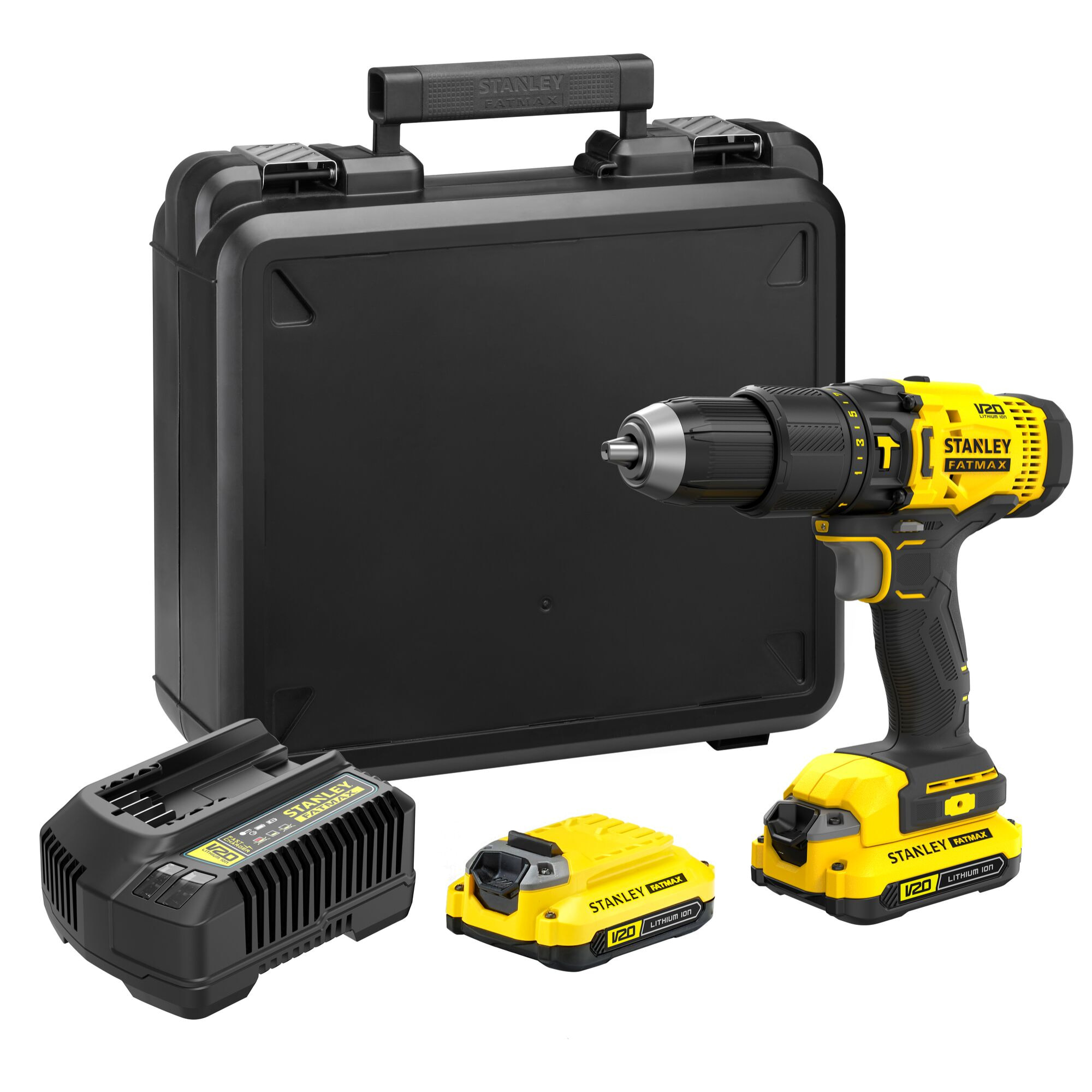 Machine génération V20, plus puissante, grâce aux batteries professionnelles - 2 batteries de 1,5Ah, 1 chargeur 1h10, couple maxi 50Nm. Mandrin 13 mm, vitesses 0-350/1500, cadence de frappe de 25,500 cps/min. echnologie de batterie améliorée, pas d'effet mémoire, auto-décharge réduite pour un maximum de productivité - une autonomie plus prolongée. Indicateur de charge de la batterie. Fonction de percission puissante avec 25500c.p.m. pour percer dans la pierre et le béton. Moteur puissant délivre un coup élevé de 50Nm et 1500c.p.m. La puissance optimale pour visser et percer en bois, métal et plastique. 24 réglages de couple. 2 vitesses variables (0-350/0.1500t.p.m.) pour un meilleur contrôle du travail. Mandrin sans clé pour un changement facile de l'accessoire. Eclairage LED pour éclairer la surface de travail. Compatible avec une batterie STANLEY FATMAX V20 18V 2.0Ah ou V20 18V 4.0Ah. Partie du système de batterie V20 18V STANLEY FATMAX – Une batterie Lithium-ion V20 18V, interchangeable avec tous les outils électroportatifs et jardinage V20 18V STANLEY FATMAX. Pour de meilleurs résultats, utiliser avec Stanley Coffret 76 pièces percage / vissage STA88544-XJ.