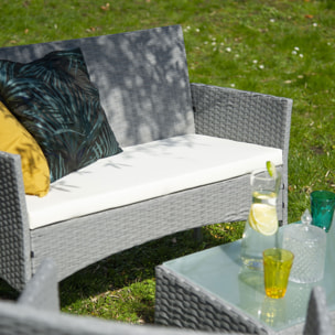 Le salon de jardin CORDOUE en résine tressée est composé de deux fauteuils et d'un canapé afin d'accueillir jusqu'à 4 personnes autour de sa table basse dotée d'un plateau en verre trempé. Conçu pour les petits espaces, il s'intégrera parfaitement sur votre terrasse ou sur votre balcon. La résine tressée qui le compose est une matière solide et durable qui résistera facilement à l'humidité et aux U.V. Pour que votre été rime avec confort et convivialité, optez pour le salon de jardin CORDOUE !