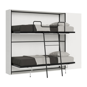 Kando H est un lit double escamotable avec une petite mais spacieuse armoire à une porte. C'est une solution originale et fonctionnelle qui permet d'optimiser l'espace disponible, n'occupant que 39,2 cm de profondeur lorsqu'il est fermé. Kando H offre le confort et la détente de deux lits simples, son design polyvalent et moderne s'adaptant à tous les styles de décoration. Il est idéal pour ceux qui vivent dans un studio ou un environnement avec des espaces limités et qui souhaitent avoir plus de surface libre pendant la journée. Lors de l'ouverture, il faut sortir le pied pour soutenir le sol du lit inférieur, tandis que l'utilisation de l'échelle en métal est obligatoire pour la stabilité du lit supérieur. Le lit est également équipé d'un mécanisme de sécurité qui assure sa stabilité et sa rigidité lorsqu'il est ouvert. Lorsqu'il est ouvert, la hauteur du matelas du lit inférieur par rapport au sol est de 47 cm - il est équipé d'une poignée pour faciliter la descente. Le lit est livré non monté. Note importante sur le montage : la fixation au mur est obligatoire - le montage du lit Kando est très difficile et nécessite deux personnes expérimentées pour le réaliser. Caractéristiques du lit : structure du réseau en fer renforcé avec peinture époxy couleur aluminium gaufré. Dimensions recommandées du matelas : 85x185 cm H.14. Lattes en hêtre de 85x190 cm. Sangles de maintien du matelas. Panneau frontal de 18 mm composé de particules de bois plaqué. Matelas non inclus. Fabriqué en Italie. Article réalisé en Italie avec un design et des matériaux 100% italiens. Inclusi avec les lits sont des matelas en waterfoam sur mesure, entièrement fabriqués en Italie. Les dimensions du matelas sont de 85x185x14 cm. Ils présentent un brodé de matelassage ornemental, un tissu damassé avec une finition jacquard de couleur grise. Le rembourrage est fait de ouate cardée et aiguilletée, avec un matelassage. La plaque interne est en water foam élastique, une mousse de polyuréthane écocompatible. Cette combinaison offre un grand confort et une structure de haute qualité pour assurer un sommeil agréable et confortable.