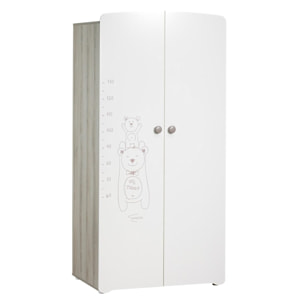 - Armoire:panneau de fibres de moyenne densité (mdf) laqué blanc avec sérigraphie teddy panneau de particules décor papier frêne cendré panneau de particules mélaminé blanc galeries en hêtre laqué blanc sommier en hêtre brut4 pieds ronds blancs bouton laqué taupe