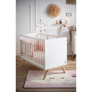Le lit 60x120 de la collection Serena va vous séduire par son élégance. La pureté du blanc est associé à un piétement en bois clair et aux courbes délicates. Confortable et élégant, ce joli lit est doté d'un sommier réglable sur 3 hauteurs pour plus de praticité.