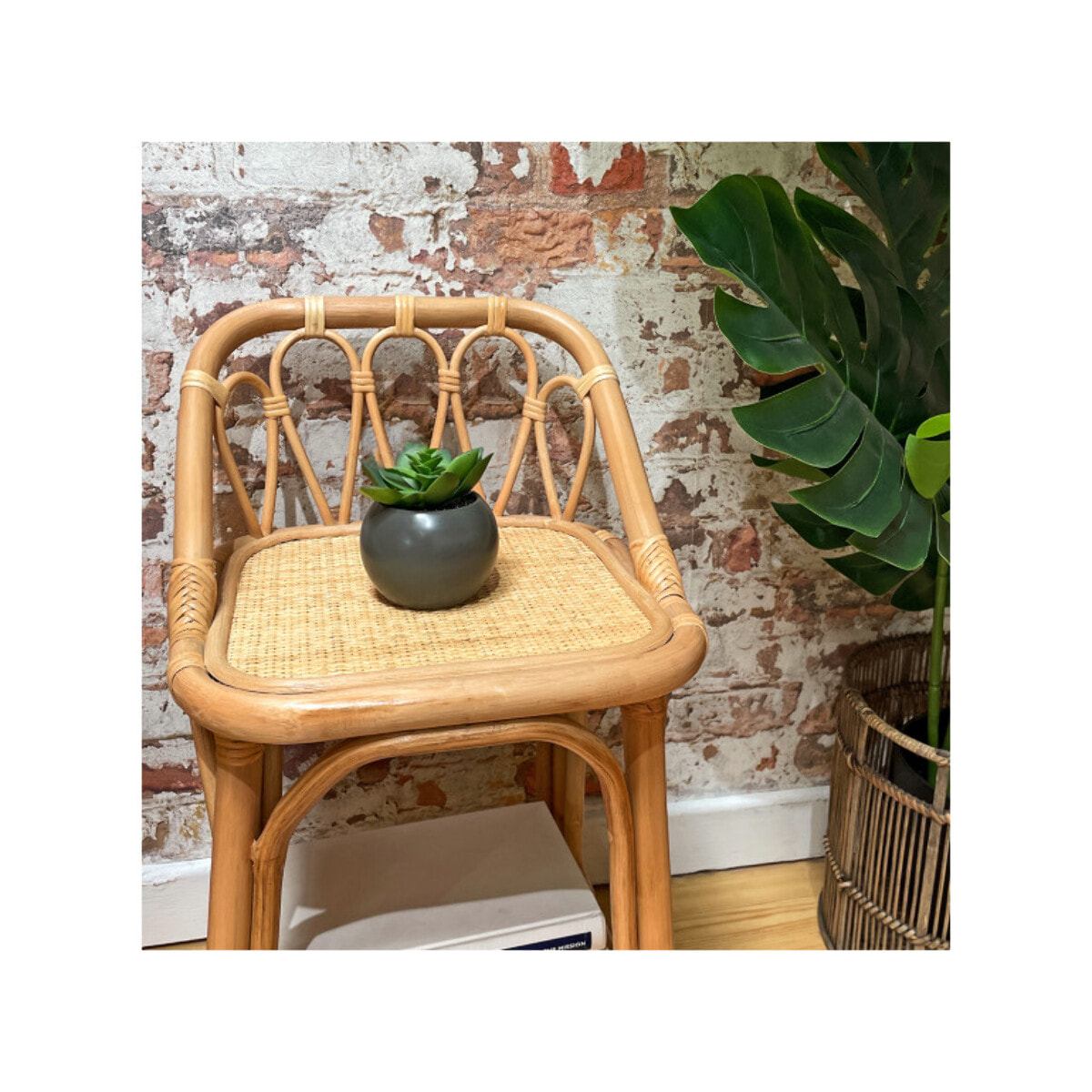 Le rotin utilisé est composé de lianes entrelacées provenant de fibres de type palmier, un matériau réputé pour sa robustesse naturelle. Cette table présente une hauteur de 55,5 cm, une longueur de 30 cm et une profondeur de 30 cm. Elle ne nécessite aucun montage et ne pèse que 1,9 kg, ce qui la rend très facile à déplacer selon vos besoins.