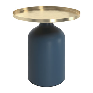 Dès le premier regard, cette petite table basse séduit par ses formes rondes et son plateau en laiton Ø45 cm. Son pied en métal bleu (Ø 28 x H 48 cm) s’harmonise avec les nuances dorées et met en valeur l’ensemble.