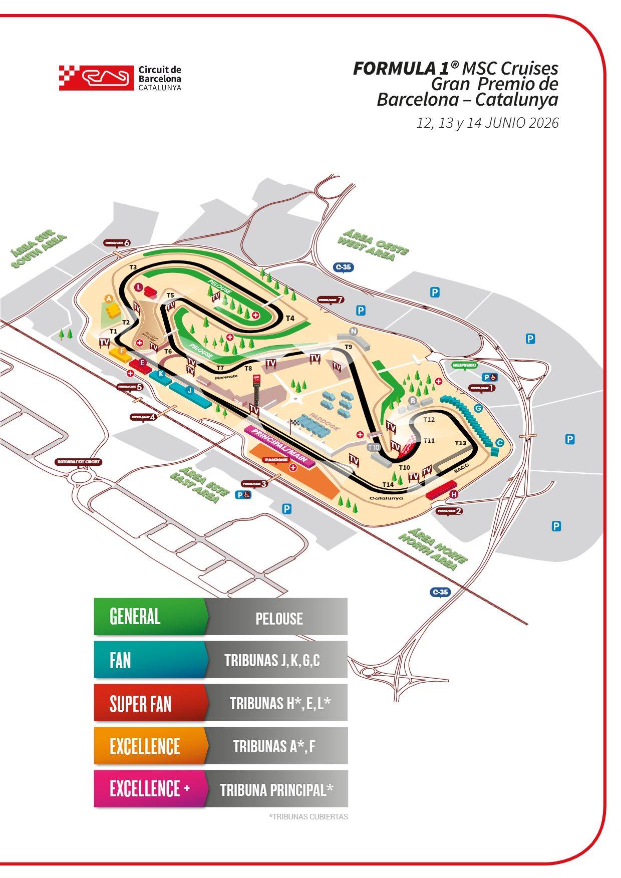 - 1 billet d'accès pour 3 jours en catégorie FAN : Tribunes J, K ou G (en bleu sur le plan). Cette tribune est située entre la grille de départ et le virage 1, à seulement quelques pas de la tribune principale. Vous aurez une vue imprenable sur la sortie de la voie des stands et sur l'action des équipes les plus proches de vous. La tribune G est située dans la zone haute du stade, c’est une des premières tribunes qui ont été construites sur le circuit. Elle offre une ample vue sur le stade et spécialement sur les virages 12, 13 et 14. L'immense tribune est l'une des plus populaires du circuit. La tribune K du GP de Catalogne offre une observation précise des charges aérodynamiques et des trajectoires à haute vitesse en sortie du virage 9 avant la zone de freinage terminale.