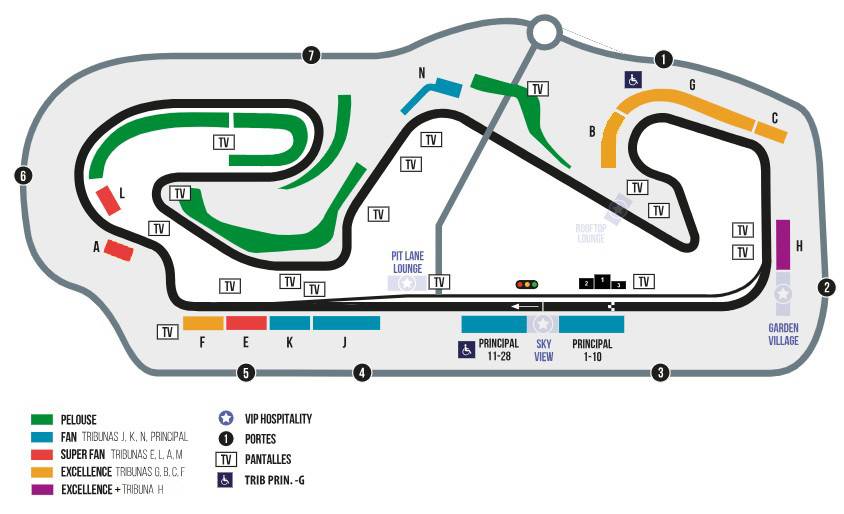 - 1 billet d'accès pour 3 jours en catégorie EXCELLENCE : Tribunes B, C, F ou G (en orange sur le plan). La tribune B offre une bonne vision des premières courbes de la zone du circuit. La tribune C propose une ample vision de la zone du circuit où se concentre la majorité des virages du circuit. La tribune F se situe au bout de la première ligne droite. Sa position idéale pour apercevoir le départ et l’arrivée de la course, mais aussi toute l’action des deux premiers virages font d’elle une des plus prisées du circuit. La tribune G est située dans la zone haute du stade et donne une vue ample sur le circuit et spécialement sur les virages 12, 13 et 14.
