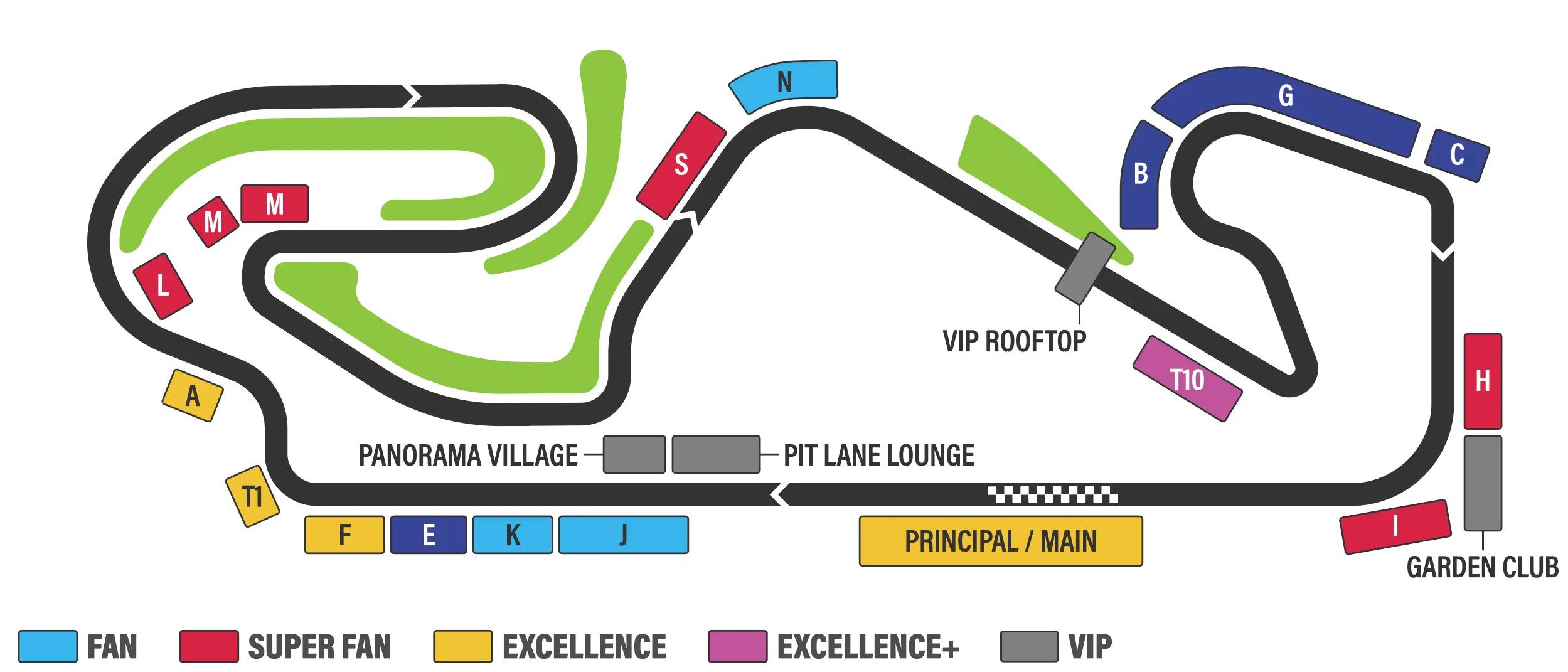 - Catégorie General Admission Pelouse (en vert sur le plan) : Emplacement libre sans siège.