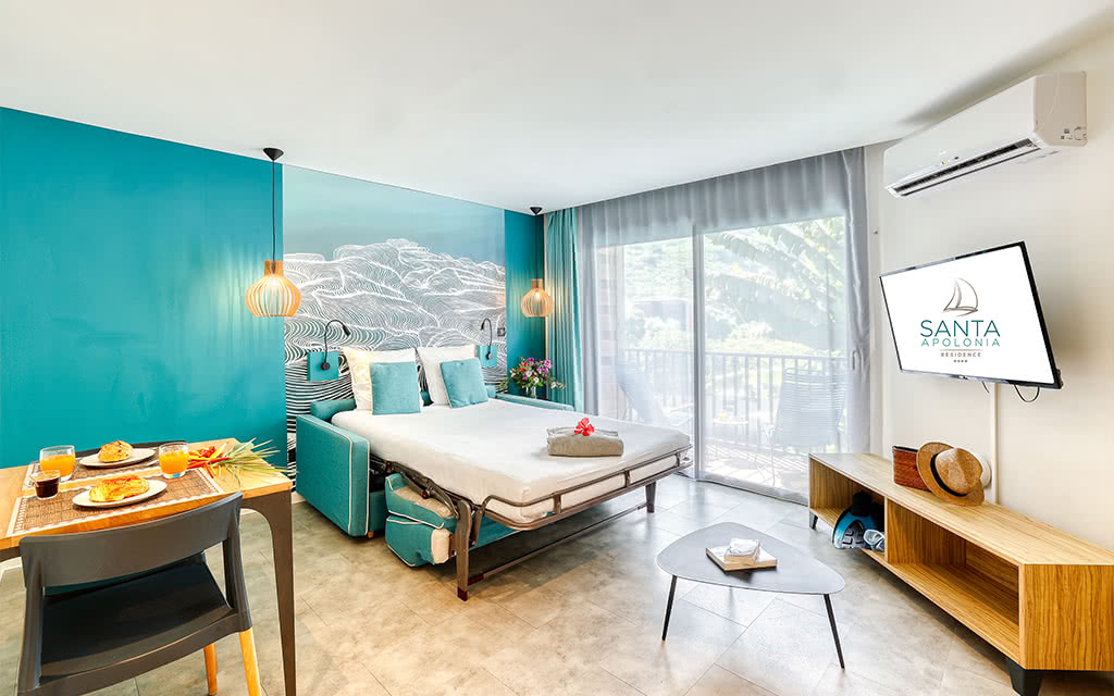 Située en plein cœur de la ville de Saint-Leu, sur la côte Sud-Ouest de l'île, en face du magnifique lagon protégé, le Santa Apolonia Résidence, propose des appartements haut de gamme, allant du studio pour 2 personnes au T4 avec 3 chambres pour 8 personnes.