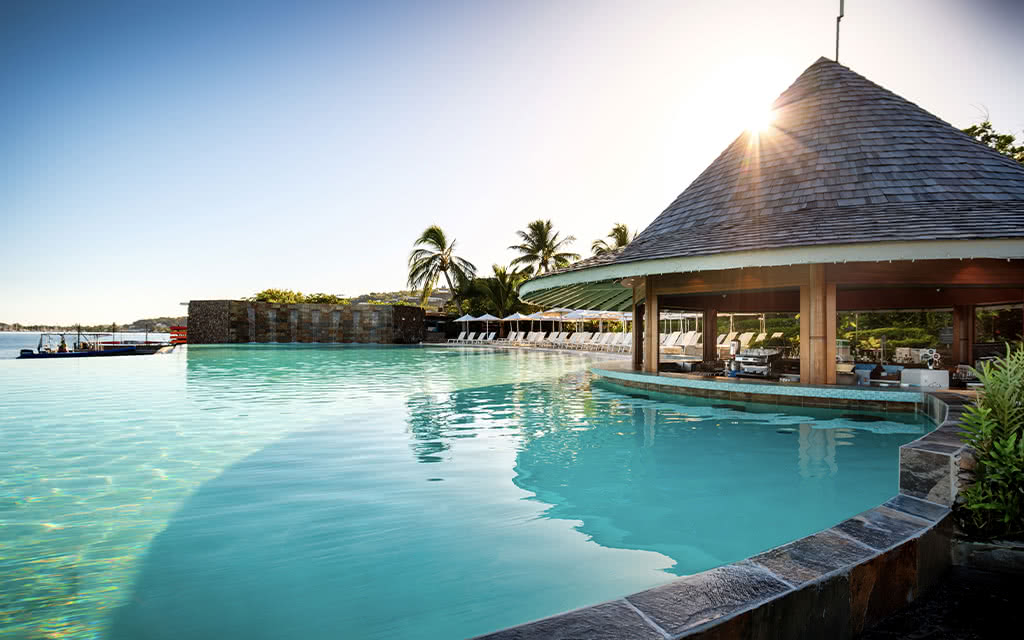 Ce bar se trouve à proximité de la plus grande piscine à débordement de l'île de Tahiti. Vous pourrez siroter vos cocktails et boissons dans la piscine ou sur un transat.