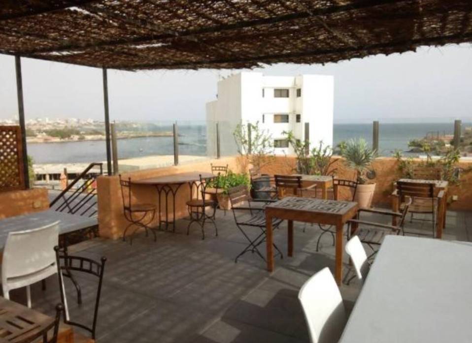 Le restaurant de l’hôtel, appelé “Les Terrasses du Djoloff”, est aménagé sur la terrasse du toit, offrant une vue panoramique sur le port de pêche de Soumbédioune et les îles de la Madeleine, créant un cadre à la fois relaxant et élégant. On y sert une cuisine de marché simple et saine : poissons frais, gambas, grillades à la plancha, complétées par des spécialités africaines authentiques. Le restaurant est ouvert pour le petit-déjeuner, le déjeuner et le dîner. Vous pourrez savourer vos repas en terrasse pour profiter du coucher de soleil ou d’une ambiance douce en soirée. En plus de l’offre alimentaire, le bar-lounge adjacent propose de se détendre dans un décor soigné, avec une sélection de boissons, idéal pour un apéritif ou un moment de relaxation après une journée de visites. L’ambiance y est conviviale, le service attentif, ce qui ajoute au charme de l’expérience culinaire de l’hôtel.