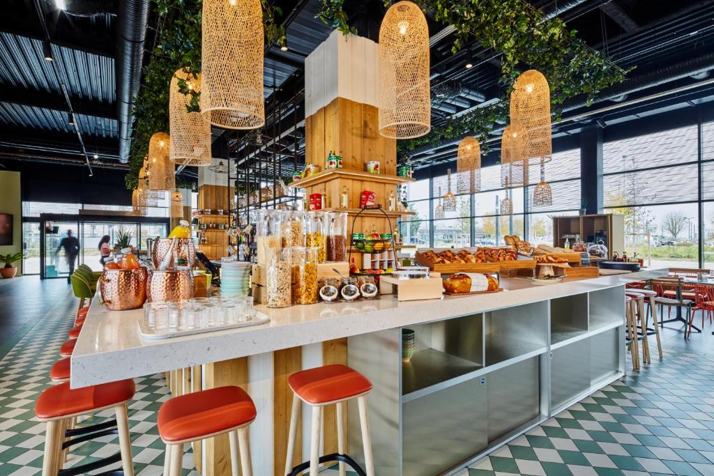 Chaque matin, un petit-déjeuner buffet complet est servi, avec une sélection sucrée et salée pour bien commencer la journée. Le restaurant Terminal 12 vous invite à savourer une cuisine de brasserie raffinée, tandis que le bar-lounge sur place est parfait pour un verre en fin de journée.