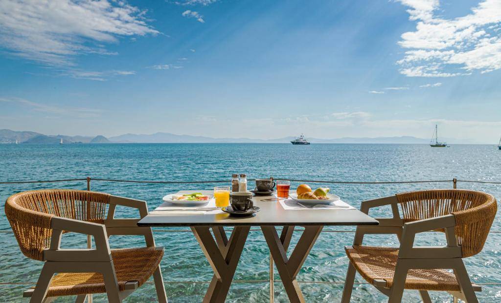 L’établissement abrite le restaurant et bar H2O, qui propose une cuisine méditerranéenne et internationale mettant en valeur des produits grecs et des fruits de mer, servis dans une ambiance détendue avec vue sur la mer. Il est ouvert pour le petit-déjeuner, le déjeuner et le dîner, avec une grande terrasse où l’on peut savourer les repas au son des vagues et profiter du cadre unique du front de mer.