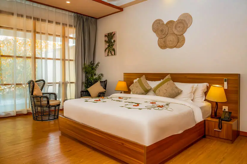 - Villa deluxe sur pilotis avec piscine privée (108 m²) : mêmes équipements, terrasse aménagée, piscine privée. Capacité maximum: 2 adultes + 2 enfants (+ lits d'appoint).