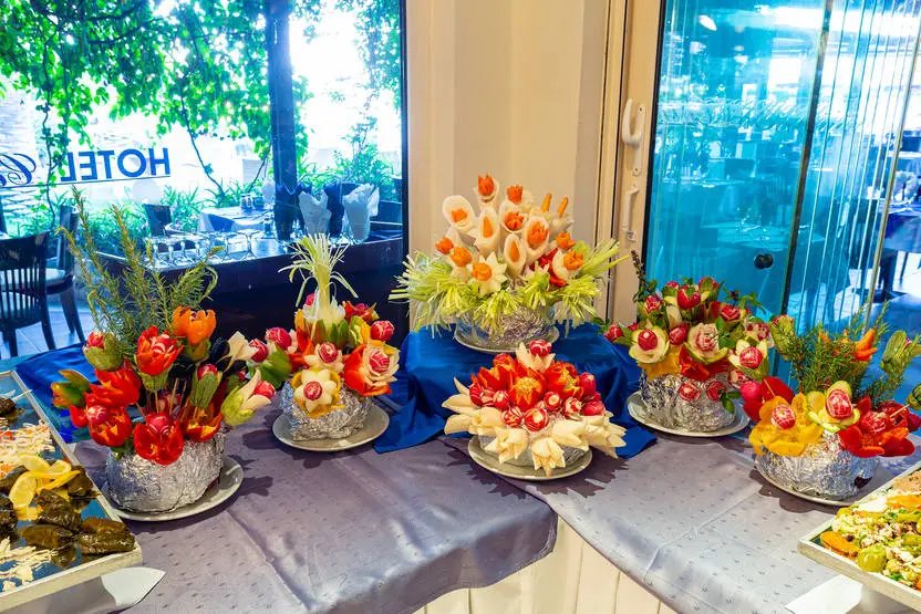 - de la pension complète (petit-déjeuner, déjeuner et dîner) servie sous forme de buffet au restaurant principal.