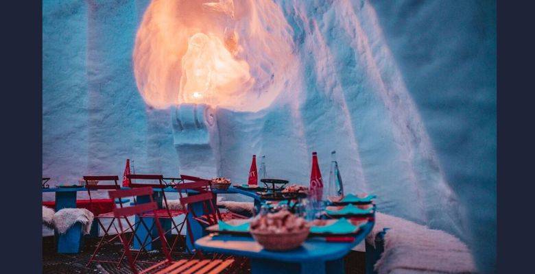 Perché à plus de 2400m d’altitude, situé au coeur des 3 Vallées, l'igloo géant propose un décor féerique, fait exclusivement de neige et de glace,